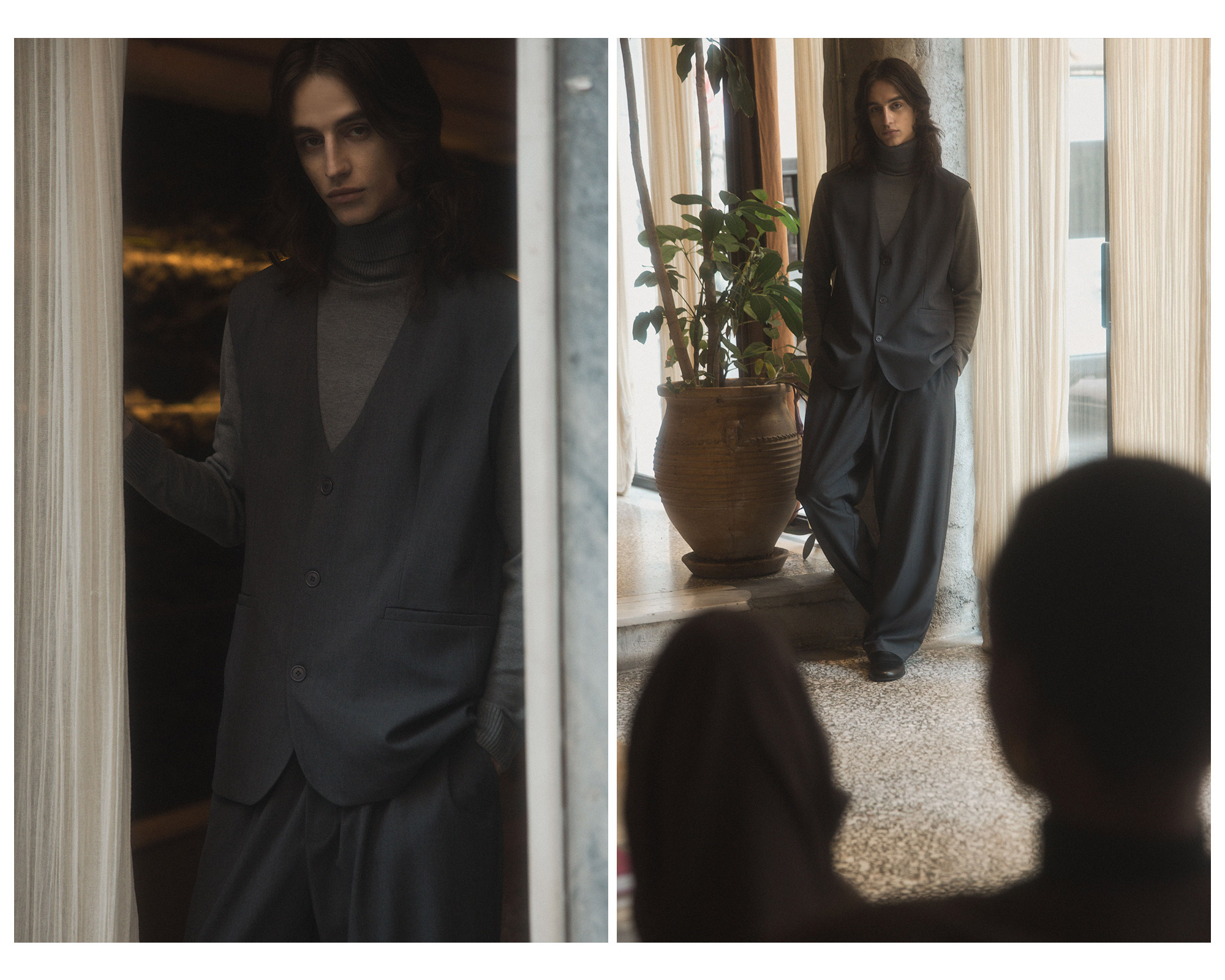 A clean, well-fitted trouser paired with a refined knit or structured top creates a strong foundation. Keep the color palette neutral and cohesive. Ivory, charcoal, deep brown, or black work beautifully for evening settings. The absence of loud details allows the quality of the pieces and the silhouette to take center stage.